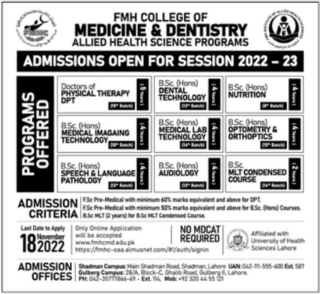 FMH College of Medicine & Dentistry has announced admissions in 2022 for DPT, BSC Dental Technology, BSc Nutrition, BSc Medical Imaging Technology, BSC Medical Lab Technology, BSc Optometry, and Orthopedics, BSc Speech and Language Pathology, BSC Audiology, BSc MLT Condensed Course. Students who want to take admissions to FMH College of Medicine & Dentistry Lahore Punjab Pakistan for the academic year 2022 to continue their education in Medical College can apply. Eligible students fulfilling the criteria for admissions in BS and DPT can enroll as per the Private admission policy 2022 till the closing date of 18 November 2022. Read newspaper ad for exact details.
