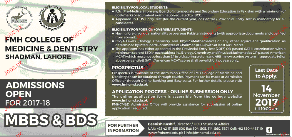 FMH College of Medicine and Dentistry Lahore Admission in MBBS and BDS in Lahore. Prospectus is available at the FMH College of Medicine and Dentistry Lahore. Read newspaper ad for exact details.