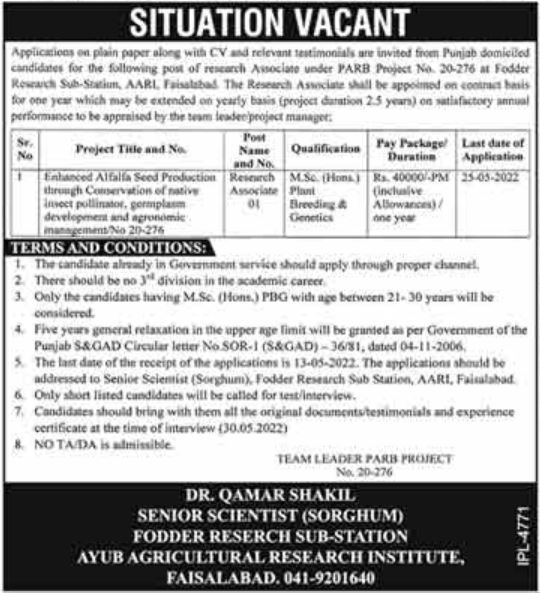 Fodder Research Sub Station, Ayub Agriculture Research Institute AARI Faisalabad, faisalabad Punjab Pakistan invites applications from eligible candidates for the post of research associate as per advertisement of May 7, 2022 published in daily Dunya Newspaper. Preferred Education is M.sc etc.