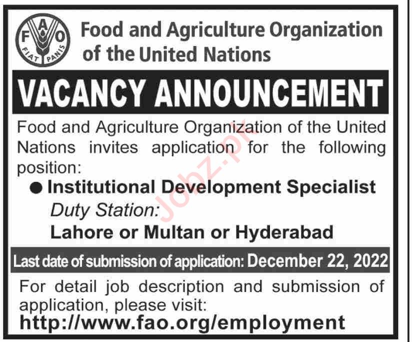 Food & Agriculture Organization FAO Hyderabad, multan and hyderabad Sindh Pakistan invites applications from eligible candidates for the post of institutional development specialist as per advertisement of December 11, 2022 published in daily Dawn Newspaper. Persons with Master and Bachelor etc. education can apply.