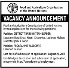 Food and Agriculture Organization FAO Dera Ghazi Khan, badin, muzaffargarh, lodhran, khanewal and multan Punjab Pakistan invites applications from eligible candidates for the post of district training team leader and programme associate as per advertisement of August 13, 2023 published in daily Jang Newspaper. Candidates with Master and Bachelor etc. educational background will be preferred.