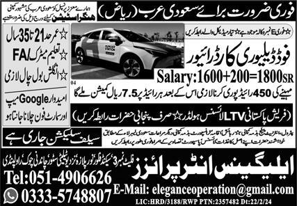 Elegance Enterprises latest Overseas Driving jobs and others can be applied till March 20, 2024 or as per closing date in newspaper ad. Read complete ad online to know how to apply on latest Elegance Enterprises job opportunities. Some jobs in Elegance Enterprises may require skills like Food Delivery, Car Driving and Driving. Salary varies from 136000. Earn more by overtime. On job transport, accommodation and medical facility is provided.