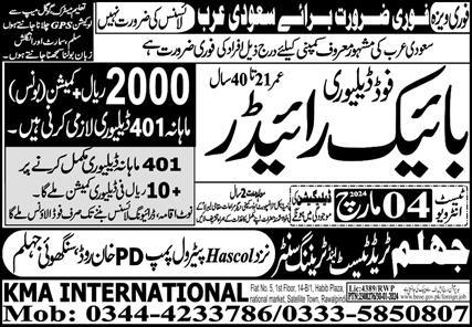 Jhelum Trade Test & Training Center jobs advertisement dated about 1 March 2024 in daily Express Newspaper invites application for the vacant post of bike rider, rider and food delivery rider in Jeddah, dammam Saudi Arabia. Persons with Intermediate and Matric etc. education can apply.