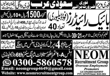 NEOM Recruitment Group jobs advertisement dated about 3 April 2024 in daily Express Newspaper invites application for the vacant post of food delivery rider, bike rider and rider in Jeddah, tabuk Saudi Arabia. Educational qualifications required Matric etc.