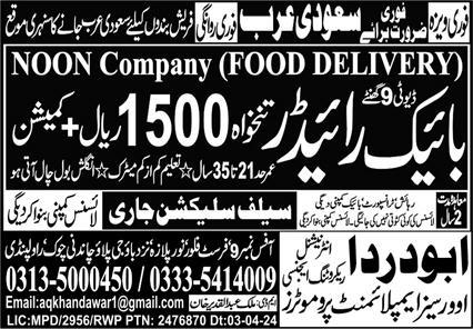 Vacant posts including rider, bike rider and food delivery rider are announced in Abu Darda International Makkah, dammam Saudi Arabia as per 4 July 2024 advertisement in daily Express Newspaper. Matric etc. educational qualification will be preferred.