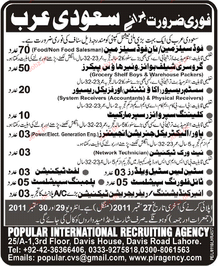 Food Salesman, Grocery Chef Boys, Cleaning Supervisor Wanted