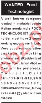 Food Technologist Job 2018 In Multan