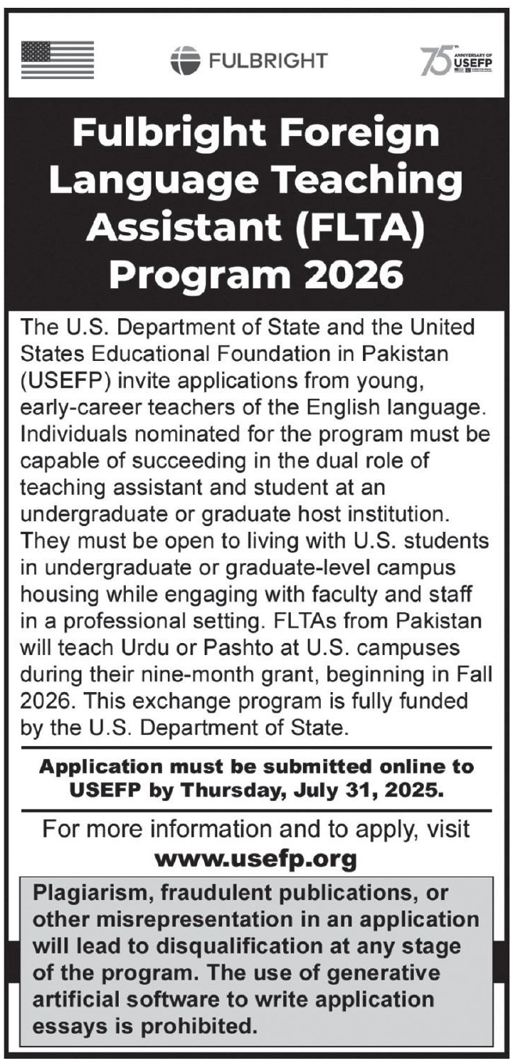 Vacant posts including foreign language teaching assistant are announced in United States Educational Foundation in Pakistan USEFP Islamabad, islamabad Islamabad Pakistan as per 15 June 2025 advertisement in daily Express Tribune Newspaper. Bachelor and Master etc. educational qualification will be preferred.