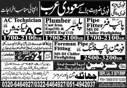 Foreman Pipe Fitting & AC Technician Jobs 2021 in KSA