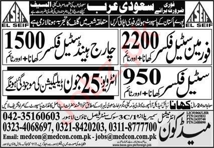 Medcon International Company jobs advertisement dated about 23 June 2024 in daily Express Newspaper invites application for the vacant post of charge hand steel fixer, steel fixer and foreman steel fixer in Riyadh, riyadh Saudi Arabia. Middle, Matric and Intermediate etc. educational qualification will be preferred.