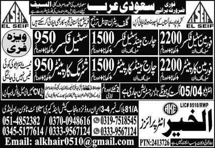 Al Khair Enterprises jobs advertisement dated about 30 July 2024 in daily Express Newspaper invites application for the vacant post of charge hand steel fixer, steel fixer, foreman carpenter, charge hand carpenter, shuttering carpenter and foreman steel fixer in Riyadh, riyadh Saudi Arabia. Preferred Education is Matric, Intermediate and Middle etc.