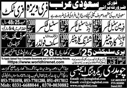 Chaudhary Recruiting Agency invites applications for job positions advertised in daily Express dated 21 August 2025 for following vacancies in Riyadh, dammam Saudi Arabia.
