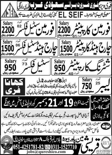 Qureshi Manpower Bureau jobs advertisement dated about 16 December 2022 in daily Express Newspaper invites application for the vacant post of foreman steel fixer, foreman carpenter, steel fixer, labor, shuttering carpenter, chargehand steel fixer and chargehand carpenter in Riyadh, madina Saudi Arabia. Candidates with Matric, Middle and Intermediate etc. educational background will be preferred.