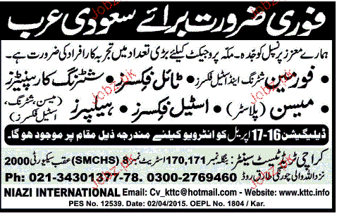 Foreman, Tile Fixers, Shuttering Carpenters Job Opportunity
