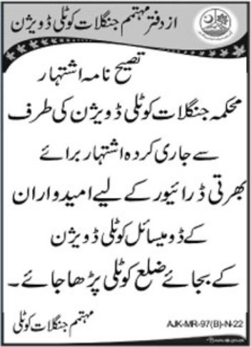 Forest Department Kotli Driver Jobs 2022 Corrigendum
