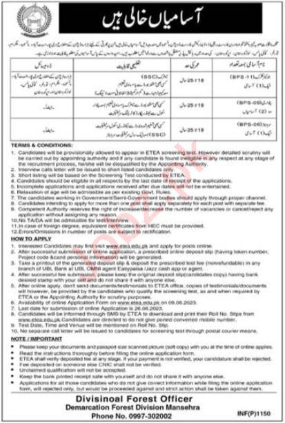 Forest Department is looking for candidates for following posts as per job advertisement published in daily Mashriq Newspaper of June 12, 2023 for location Mansehra, mansehra Khyber Pakhtunkhwa KPK Pakistan: