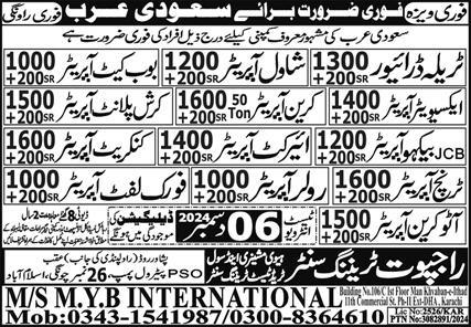 Vacant posts including excavator operator, air cut operator, fork lift operator, jcb backhoe operator, trench operator, bobcat operator, shawl operator, driver, htv driver, traila driver, crane operator, concrete operator, crush plant operator, auto crane operator and roller operator are announced in Rajput Training Center Riyadh, dammam Saudi Arabia as per 27 November 2024 advertisement in daily Express Newspaper. Persons with Intermediate, Matric and DAE etc. education can apply.