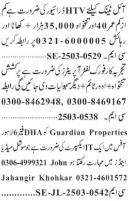 Private Company invites applications for job positions advertised in daily Jang dated 18 March 2025 for following vacancies in DHA Phase 6 Lahore, lahore Punjab Pakistan.