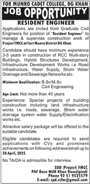 Fort Munro Cadet College Rawalpindi, rawalpindi Punjab Pakistan invites applications from eligible candidates for the post of resident engineer as per advertisement of April 24, 2025 published in daily Jang Newspaper. Bachelor etc. educational qualification will be preferred.