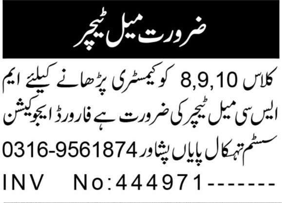 Forward High School jobs advertisement dated about 11 September 2025 in daily Aaj Newspaper invites application for the vacant post of teacher and chemistry teacher in Tehkal Peshawar, peshawar Khyber Pakhtunkhwa KPK Pakistan. Persons with M.sc and Master etc. education can apply.