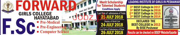 Forward Public School For Boys Admission in Fsc Pre Medical, Pre Engineering and Computer Sciences in Peshawar. Last date for submission of admission forms is 26 July 2018. Read newspaper ad for exact details.