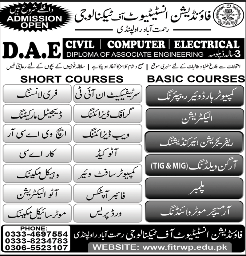 Foundation Institute of Technology Diploma of Associate Engineering DAE in Civil Engineering, Computer Information Technology, Electrical Engineering, Short Courses of Computer Hardware Repairing, Electrician, Refrigeration Air Conditioning, Organ Welder, MIG Welding, TIG Welding, Plumber, Armature Motor Winding, Certificate in IT, Freelancing, Graphics Designing, Digital Marketing, Web Designing, HVACR, AutoCad, Car AC, Computer Software, Vehicle Mechanic, Fiber Optics, Auto Electrician, Word Press, admissions 2022 has been started. Foundation Institute of Technology Rawalpindi Punjab Pakistan welcomes students to apply for admissions in academic year 2022 in Technical Course. Students for admissions in Diploma, DAE and Course & criteria can apply as per Government institute admission policy 2022 before closing date August 17, 2022 as per advertisement. Read newspaper ad for exact details.