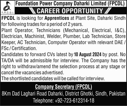 Foundation Power Company Daharki Ltd FPCDL Ghotki, ghotki Sindh Pakistan invites applications from eligible candidates for the post of Technician Apprentice, Machinist Apprentice, Plumber Apprentice, Lab Technician Apprentice, Plant Operator Apprentice, Electrician Apprentice, Welder Apprentice, Computer Operator Apprentice, Ac Technician Apprentice and Store Keeper Apprentice as per advertisement of August 1, 2024 published in daily Kawish Newspaper. Preferred Education is Intermediate and Matric etc.