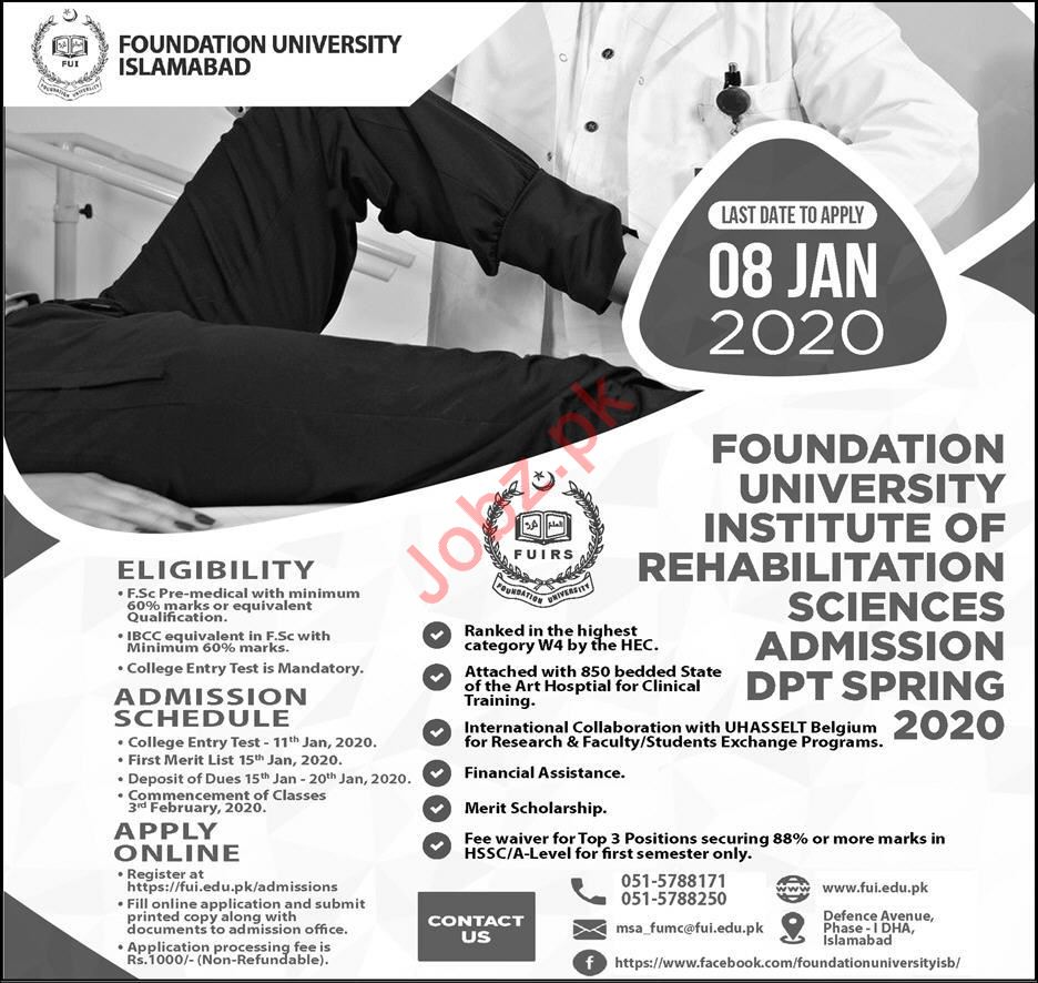Foundation University is a private university located in Islamabad Pakistan has announced admissions for Doctor of Physiotherapy DPT Spring 2020. Last date to apply 08 Jan 2020. Read newspaper ad for exact details.