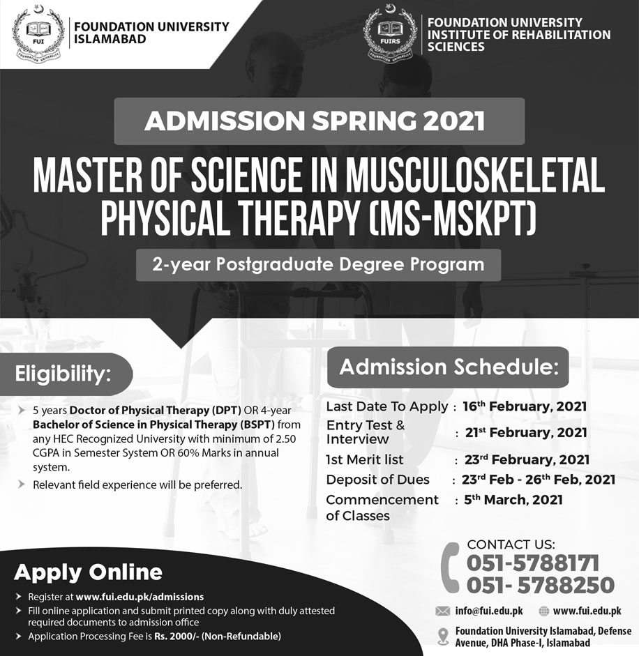 Foundation University Islamabad is a private university invites applications for admissions in Master of Science in Musculoskeletal Physical Therapy MS-MSKPT 2 Year Postgraduate Degree Program 2021. Read newspaper ad for exact details.