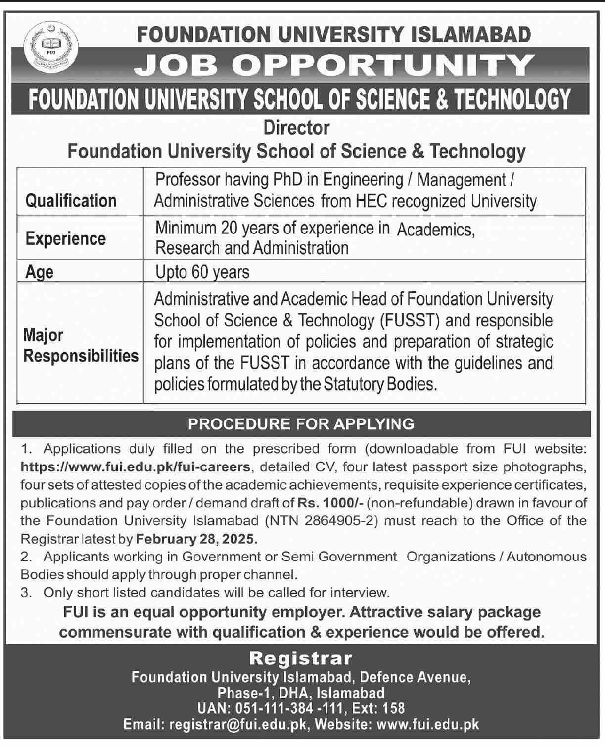 Foundation University Islamabad Islamabad, islamabad Islamabad Pakistan invites applications from eligible candidates for the post of professor as per advertisement of February 3, 2025 published in daily Dawn Newspaper. Persons with Phd etc. education can apply.