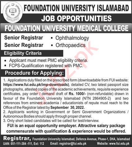 Foundation University Islamabad Islamabad, islamabad Islamabad Pakistan invites applications from eligible candidates for the post of registrar orthopaedic and registrar opthalmology as per advertisement of September 11, 2022 published in daily Express Newspaper. Persons with MBBS, Phd and Mphil etc. education can apply.