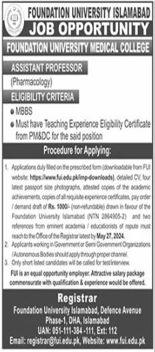 Vacant posts including assistant professor are announced in Foundation University Islamabad Islamabad, islamabad Islamabad Pakistan as per 19 May 2024 advertisement in daily The News Newspaper. Candidates with MBBS etc. educational background will be preferred.