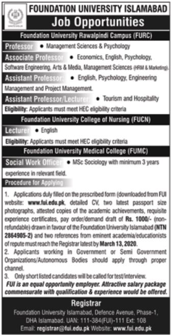 Vacancies in Foundation University Islamabad Advertisement March 2020