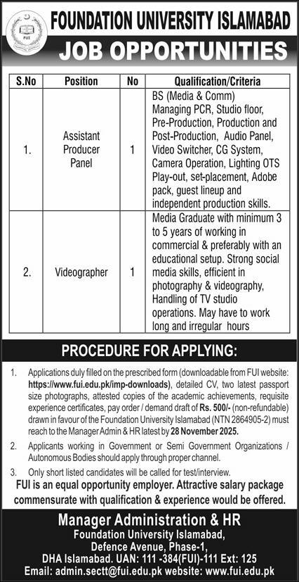 Foundation University Islamabad Islamabad, islamabad Islamabad Pakistan invites applications from eligible candidates for the post of assistant producer panel and videographer as per advertisement of November 17, 2025 published in daily Express Newspaper. Preferred Education is Intermediate and Bachelor etc.