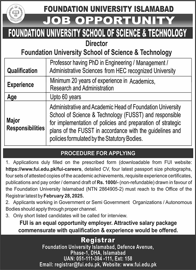 Vacancies in Foundation University Islamabad Advertisement February 2025