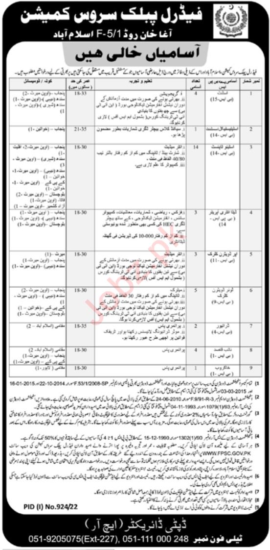 Federal Public Service Commission FPSC jobs advertisement dated about 16 August 2022 in daily Aaj Newspaper invites application for the vacant post of assistant, naib qasid, lower division clerk, khakroob, udc, stenotypist, statistical assistant, deo, sweeper, data entry operator, ldc, driver and upper division clerk in Islamabad, islamabad Islamabad Pakistan. Persons with Primary, Bachelor, B.com, BA, Matric, Master and Intermediate etc. education can apply.