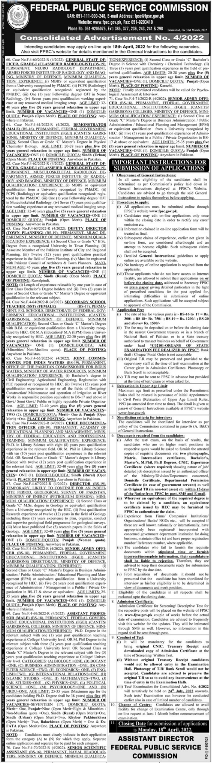 Federal Public Service Commission FPSC Islamabad, islamabad Islamabad Pakistan invites applications from eligible candidates for the post of Admin Officer, Deputy Director Town Planning, Demonstrator, Assistant Professor Urdu, Assistant Professor Botany, Assistant Professor Business Administration, Chief Documentation Officer, Assistant Professor Psychology, Joint Commissioner For Indus Water, Director, Assistant Professor Political Science, Assistant Professor Physics, Secondary School Teacher, Scientific Assistant, Classified Radiologist, Assistant Professor Biology, Assistant Professor International Relations, Assistant Professor Mathematics, Assistant Professor Islamic Studies, General Staff Officer, Assistant Professor English, Assistant Professor Economics, Assistant Professor, Sst, Assistant Professor Computer Science and Assistant Professor Pak Studies in following department as per advertisement of April 3, 2022 published in daily Kawish Newspaper.