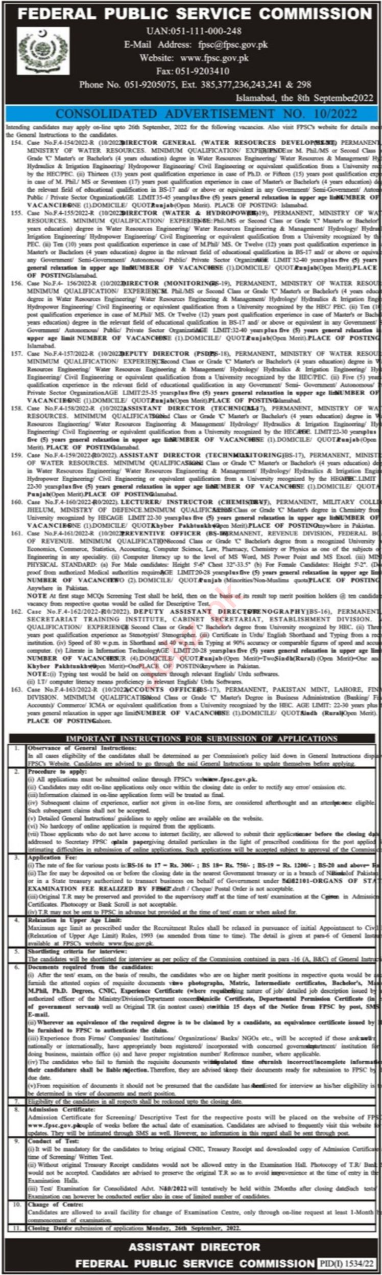 Federal Public Service Commission FPSC is looking for candidates for following posts as per job advertisement published in daily Mashriq Newspaper of September 12, 2022 for location Islamabad, islamabad Islamabad Pakistan: