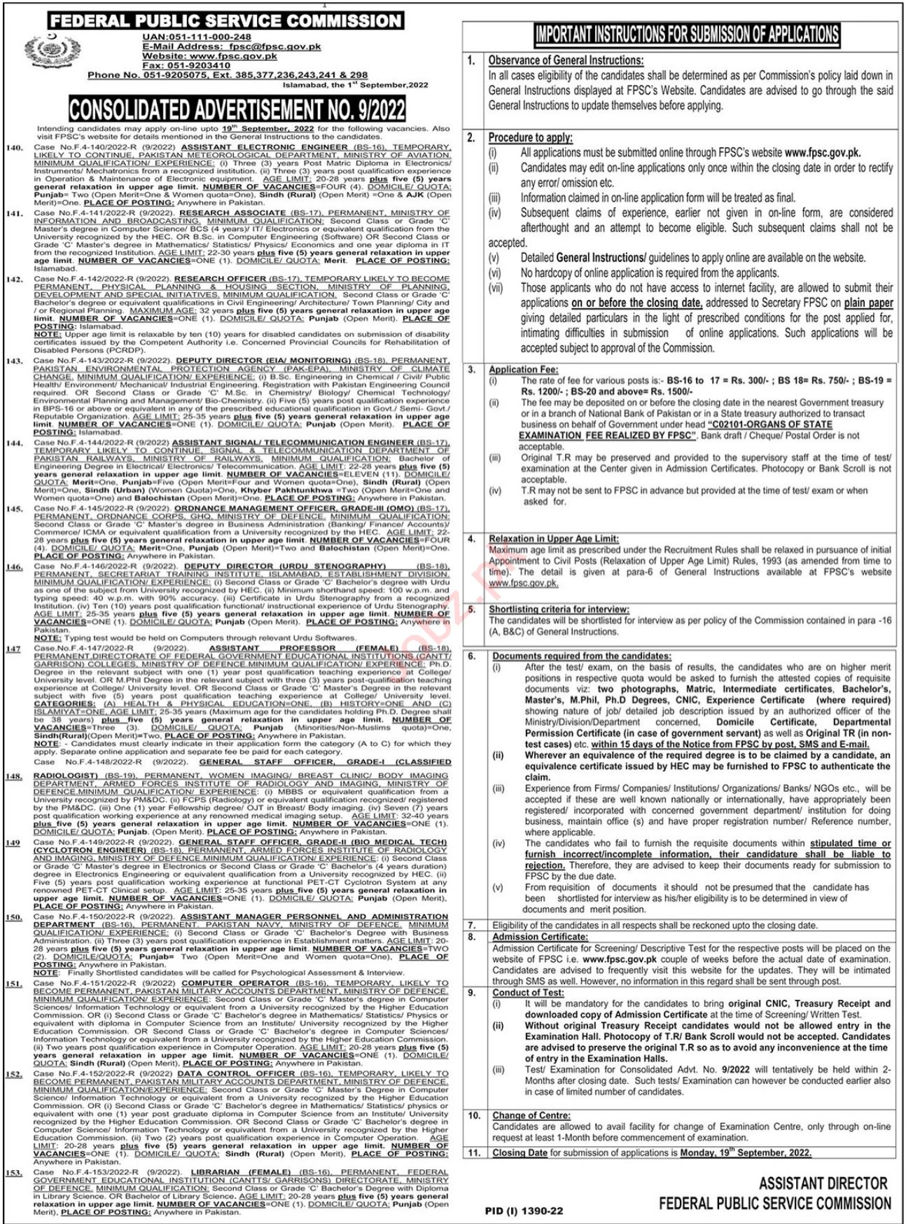 Federal Public Service Commission FPSC jobs advertisement dated about 4 September 2022 in daily The News Newspaper invites application for the vacant post of computer operator, research officer, research associate, general staff officer, ordnance management officer, assistant manager personnel administrative department, deputy director fia monitoring, assistant electronic engineer, deputy director urdu, assistant telecommunication engineer, assistant signal engineer, female assistant professor, female librarian and data control officer in Islamabad, islamabad Islamabad Pakistan. Candidates with Master, MA, BBA, Mphil, M.sc, MBA and Bachelor etc. educational background will be preferred.