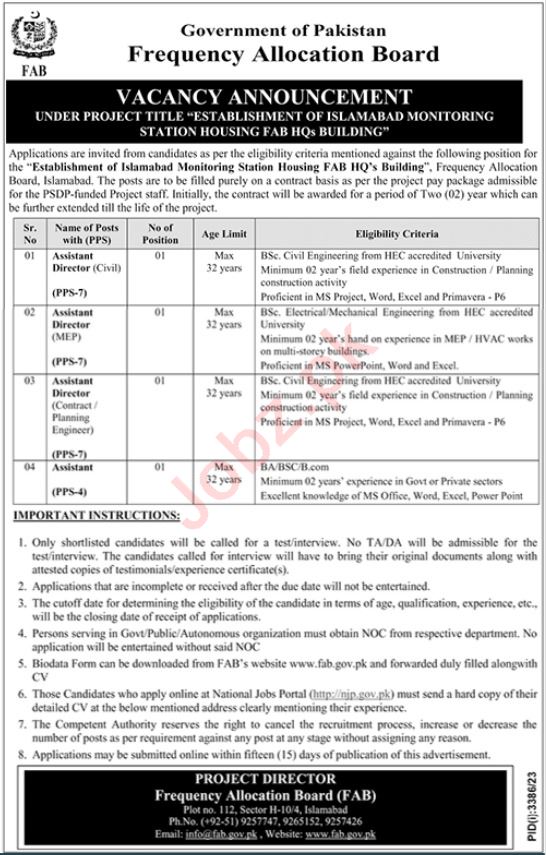 Vacant posts including assistant director mep, assistant director contract, assistant director civil, assistant and assistant director planning engineer are announced in Frequency Allocation Board Islamabad, islamabad Islamabad Pakistan as per 3 December 2023 advertisement in daily Jang Newspaper. Candidates with B.E, Bachelor, Master and Others etc. educational background will be preferred.