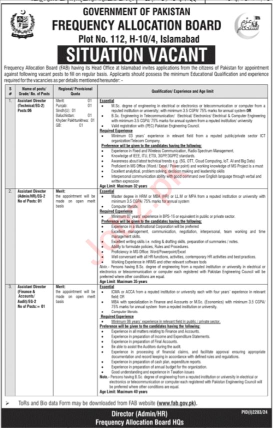 Frequency Allocation Board invites applications for job positions advertised in daily Jang dated 29 September 2024 for following vacancies in Islamabad, islamabad Islamabad Pakistan.