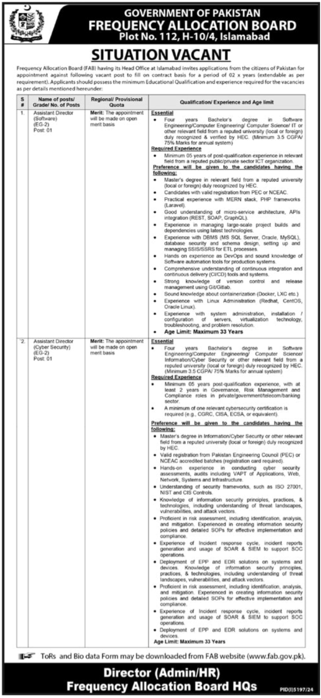 Vacant posts including Assistant Director Cyber Security and Assistant Director Software are announced in Frequency Allocation Board Islamabad, islamabad Islamabad Pakistan as per 4 February 2025 advertisement in daily Mashriq Newspaper. Candidates with MS, Bachelor and Master etc. educational background will be preferred.