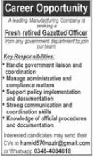 Fresh Retired Gazetted Officer Jobs at Manufacturing Company