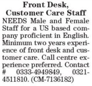 Private Company Lahore, lahore Punjab Pakistan invites applications from eligible candidates for the post of customer care staff and front desk officer as per advertisement of August 12, 2023 published in daily The News Newspaper. Bachelor and Intermediate etc. educational qualification will be preferred.