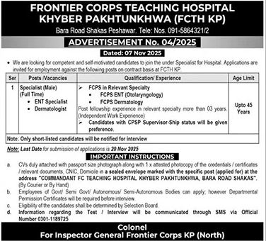 Frontier Corps Teaching Hospital FCTH is looking for candidates for following posts as per job advertisement published in daily The News Newspaper of November 14, 2025 for location Peshawar, peshawar Khyber Pakhtunkhwa KPK Pakistan: