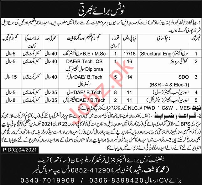 Headquarters Frontier Corps Balochistan South Turbat, Government of Pakistan is looking for the services from experienced candidates for the posts of Engineer, Civil Engineer, Structural Engineer, Quantity Surveyor, SDO, Overseer, Sub Engineer, Mechanical Engineer.