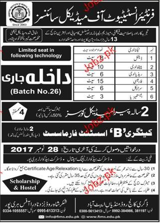 Frontier Institute of Medical Sciences Admission in Courses in Dental, Pathology, Radiology, Pharmacy, Surgical and Two year Para Medical Courses in Peshawar. Read newspaper ad for exact details.