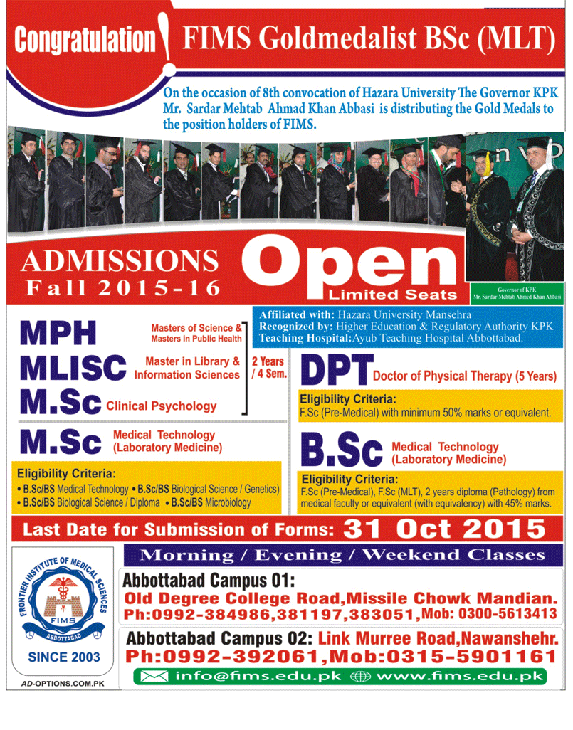 Frontier Institute of Medical Sciences Admission in MPh, MLISC, MSc, DPT and BSc in Peshawar. Read newspaper ad for exact details.