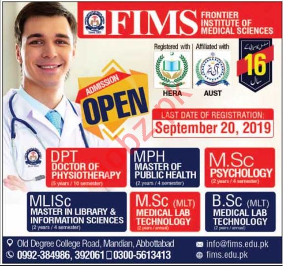 Frontier Institute of Medical Sciences has announced the admissions in Doctor of Physiotherapy DPT, Master of Public Health MPH, M,Sc Psychology, Master in Library and Information Sciences, M.Sc Medical Lav Technology, B.Sc Medical Lab Technology in Abbottabad. Read newspaper ad for exact details.