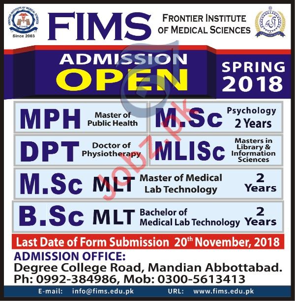 Frontier Institute of Medical Sciences FIMS Peshawar, Pakistan are announced admissions 2018 for the classes of DPT (Doctor of Physical Therapy), MPH, (M Sc, B Sc) MLT, MSc. Read newspaper ad for exact details.